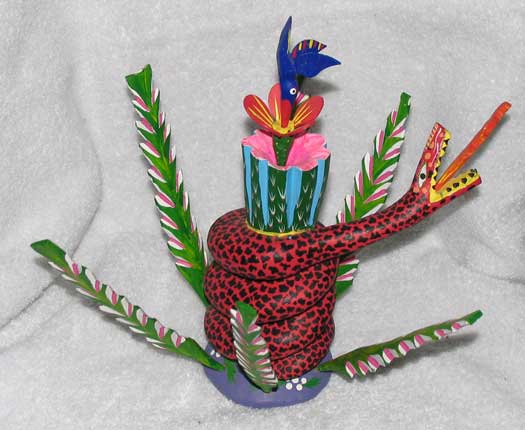 The figures ranged from dragons, deer, rabbits, armadillos, mermaids, devils, angels, animals with the faces of other animal or human faces, humans with animal faces, reptilian like creatures, and much more. All were painted in unusual, even startling color combinations. Among our numerous purchases, we choose a splendid piece that depicts a snake coiled around a cactus with a hummingbird imbibing nectar from its flower. It was a great pleasure to meet these unassuming, but immensely talented artists, and in our own small way become a part of the tradition of the alebrijes.