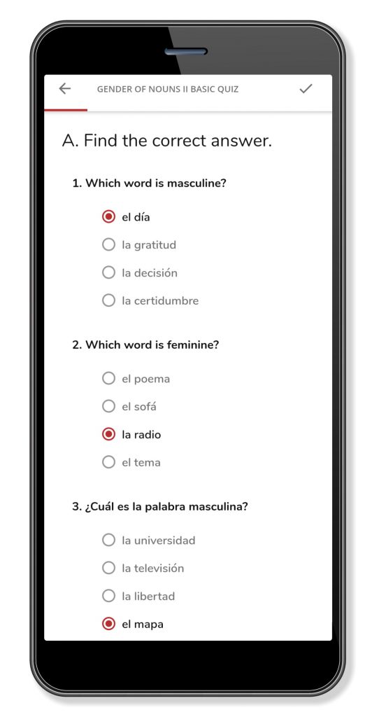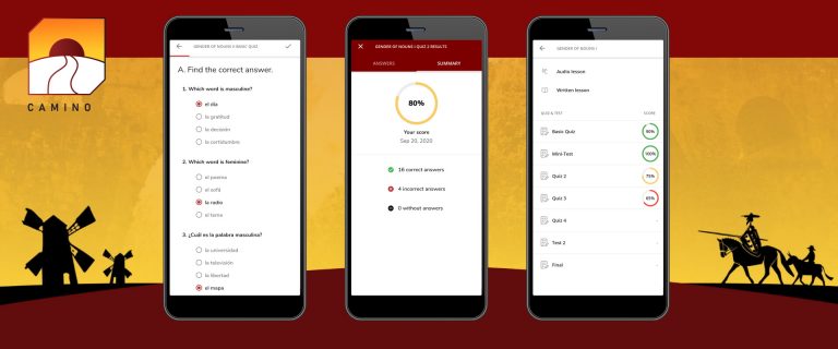 The newest version of Camino updated the app to provide tests and quizzes for all of our Spanish grammar lessons.
