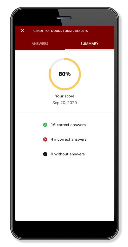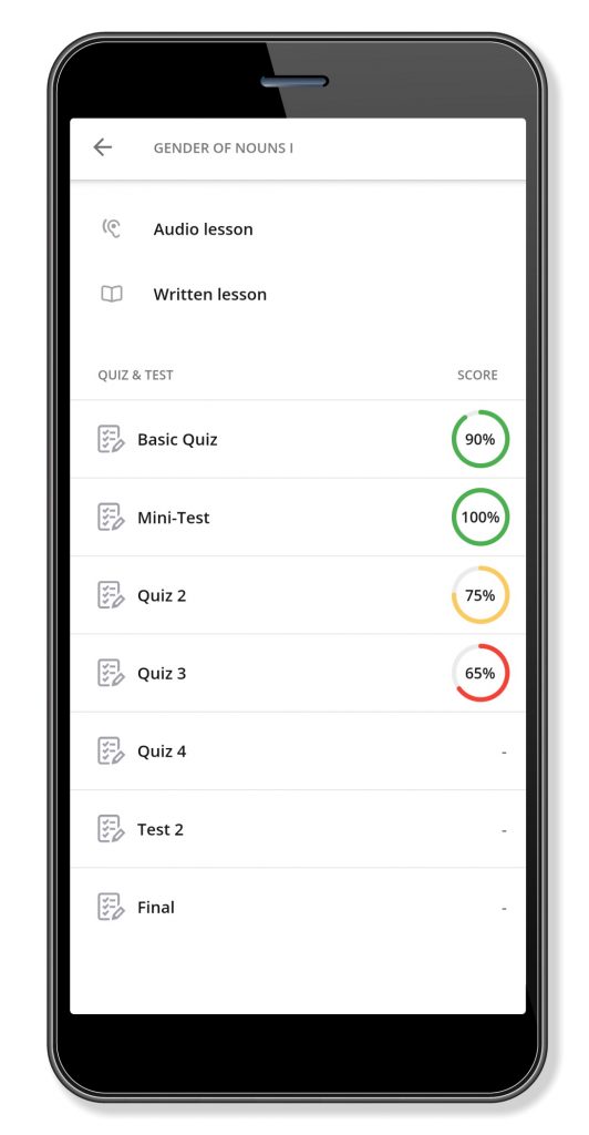 By going into any grammar lesson in Camino you will be able to see how you’ve done on past tests that you’ve submitted. You will also see any of them that you have yet to submit.