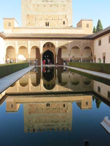 La Alhambra, exteriormente, es puro equilibrio armónico para los sentidos: el verde de la vegetación y los muros rojizos parecen coexistir desde siempre, la música del agua en las acequias, los cantos de los ruiseñores en la arboleda, y la luz, esa luz granadina que todo lo anima y levanta el espíritu. Uno comprende, contemplándola, las lágrimas de Boabdil, último rey moro de Granada, cuando, derrotado por los cristianos, se vio obligado a abandonarla…