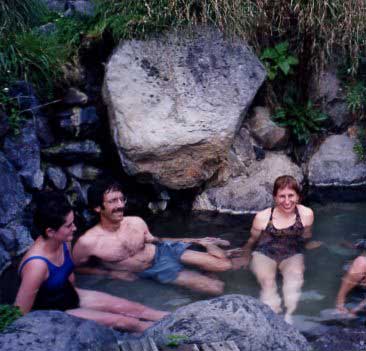 Llegamos a los manantiales térmicos en unas dos horas, y nos dispusimos a hacer nuestros experimentos. Jurando cumplir con las más rigurosas normas del método científico, calibramos nuestros trajes de baño y zapatillas de hule. Iba a ser un día arduo y difícil que incluiría 8 piscinas termales de diferentes temperaturas, 3 piscinas frías y una de agua de río, y todas exigían ser probadas con cuidado. Había que poner a prueba la afirmación de que las piscinas son “minerales, cristalinas, hipertérmicas, hipertónicas, sulfatadas y alcalinas, lo que les da la calidad de ocasionar efectos curativos en sus usuarios, porque son volcánicas en origen, en tanto claras”. No estábamos seguros del significado de todo esto, pero las aguas eran muy agradables.