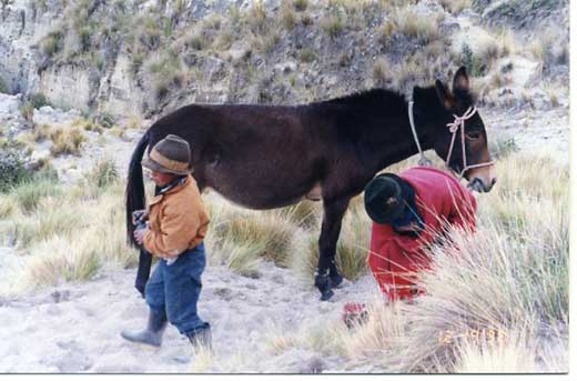 Al subir de nuevo con dificultad en el escaso oxígeno, pasamos a la mujer con el burro y nos damos cuenta de su intención. Está esperando que uno de nosotros se desmaye para llevarnos en el burro y cobrarnos un poco de dinero. No obstante, hoy llegamos a la cima por nuestra propia cuenta. Allí nos espera la mitad de los habitantes del pueblo, que han organizado una feria instantánea de artesanías para nuestro beneficio. Las obras representan la vida indígena pintada sobre piel de oveja. En el fondo de cada pintura, un gran volcán nevado se eleva a los cielos. Compramos varias obras para recordar esta tierra cruda y dinámica, y a los robustos descendientes de los incas, que se las han arreglado para ganarse la vida a la sombra de los volcanes.