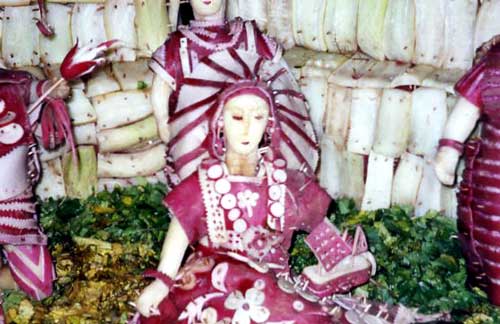 A variety of techniques are employed to create these folk art masterpieces, but whatever the approach, the crowd loves the exhibition. Popping flashbulbs punctuate the proceedings as cries of amazement ripple through the onlookers when a particularly inventive display is encountered. Soon a winner will be chosen, but even the most diligent spraying cannot keep the masterworks from browning and wilting in the warm Oxacan night. The people drift off, perusing the many craft booths, or perhaps sampling some of the many sweets and pastries made especially for the holiday season. The Night of the Radishes is over until next year.