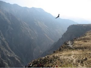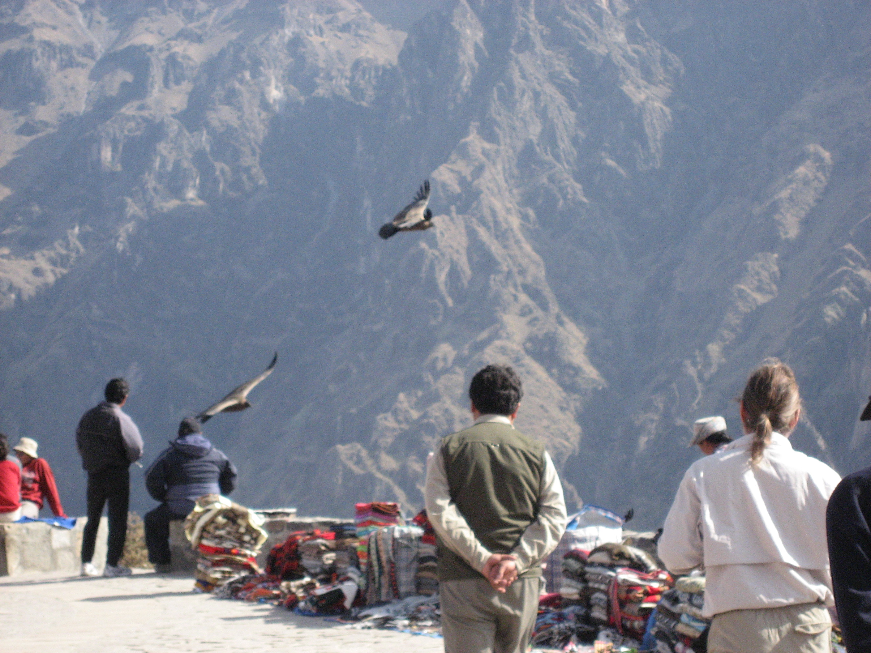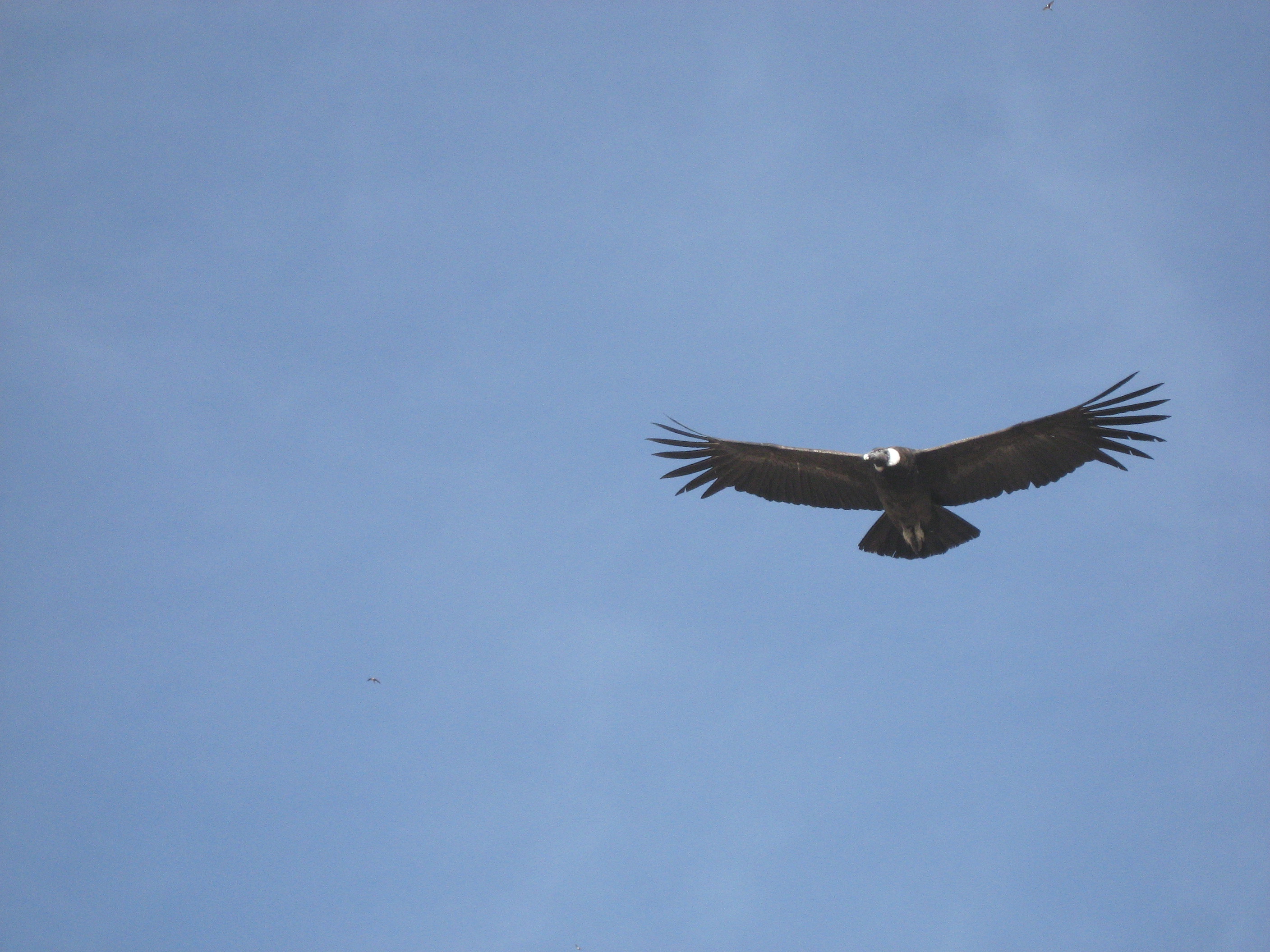 La experiencia de tener un ave de 30 libras y una envergadura de 10 pies de vuelo sobre nosotros fue algo increíble. Miembro de la familia del buitre, el cóndor es el pájaro terrestre volador más grande del hemisferio oeste. Una vez en alto, rara vez aletean. Al observarles remontarse sin esfuerzo a través del sol y a través del azul cielo andino, era tentador romantizarlos como criaturas que vivían en completa libertad mientras inspeccionaban su dominio desde alturas de hasta 18.000 pies. Pero en realidad era más duro. Deben de cubrir vastas distancias con la esperanza de encontrar animales muertos, como una vicuña, de la familia de la llama. A menudo pasan días sin comer, y cuando encuentran un cadáver comen tanto que algunas veces son incapaces de volar después. Tras la comida se limpian con cuidado la cabeza y el cuello, el cual se desplumó con el tiempo con el objetivo de poderse esterilizar con luz ultravioleta y alas de secado, lo cual ayuda a matar los gérmenes que puedan adherirse a ellos después de sumergirse en un cadáver putrefacto.