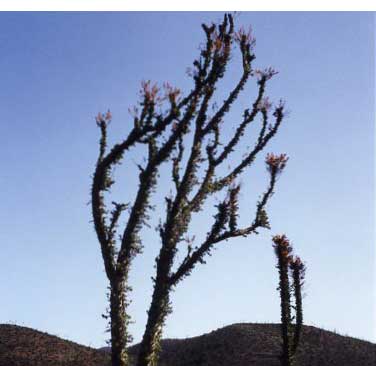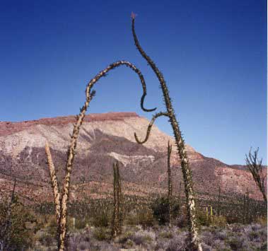 The Vizcaino Desert encompasses roughly the middle portion of Baja California, with an average annual rainfall of between 2-6 inches. Many of the desert’s 300 cactus species have evolved to quickly gather and store water after a rain, enabling them to survive the hot, dry summer. Some rodents actually hibernate through the hot periods to conserve moisture. Some animals, like the kangaroo rat , obtain all the moisture they need from the seeds they eat. Many birds get the majority of their moisture from the insects and animals they eat. These adaptations have allowed a wide variety of plants and animals to survive in this desert.